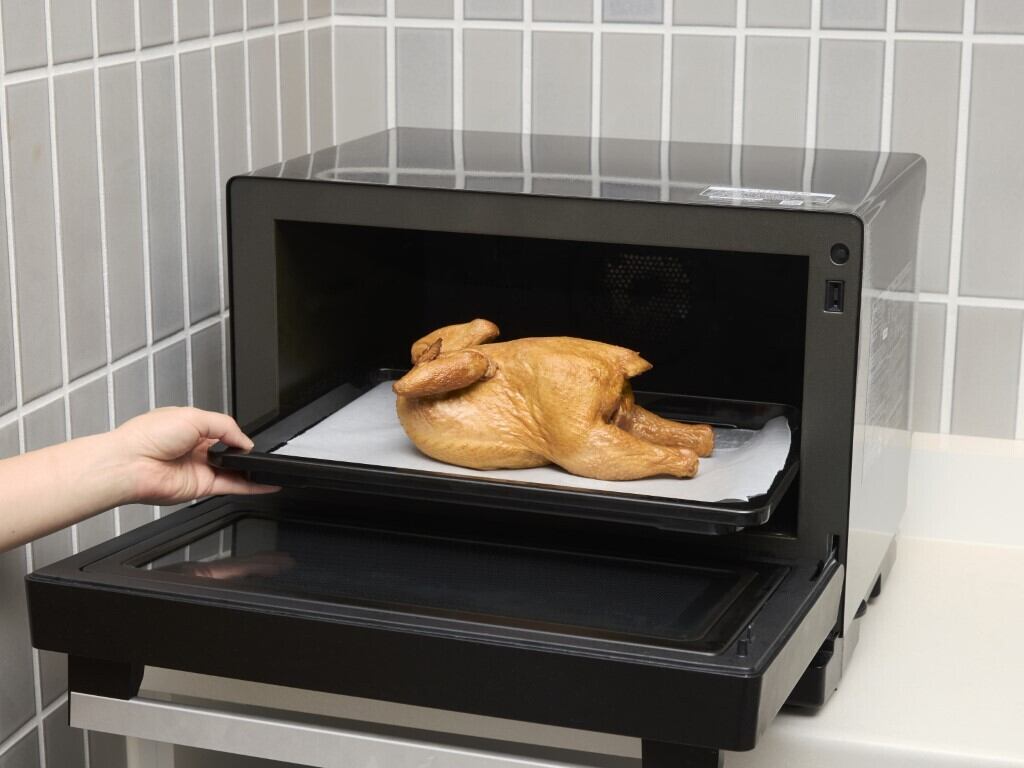 ② 解凍後、袋を開け耐熱皿にのせオーブンで加熱します(170℃の予熱後、170℃で表面25分、裏面25分加熱します)。