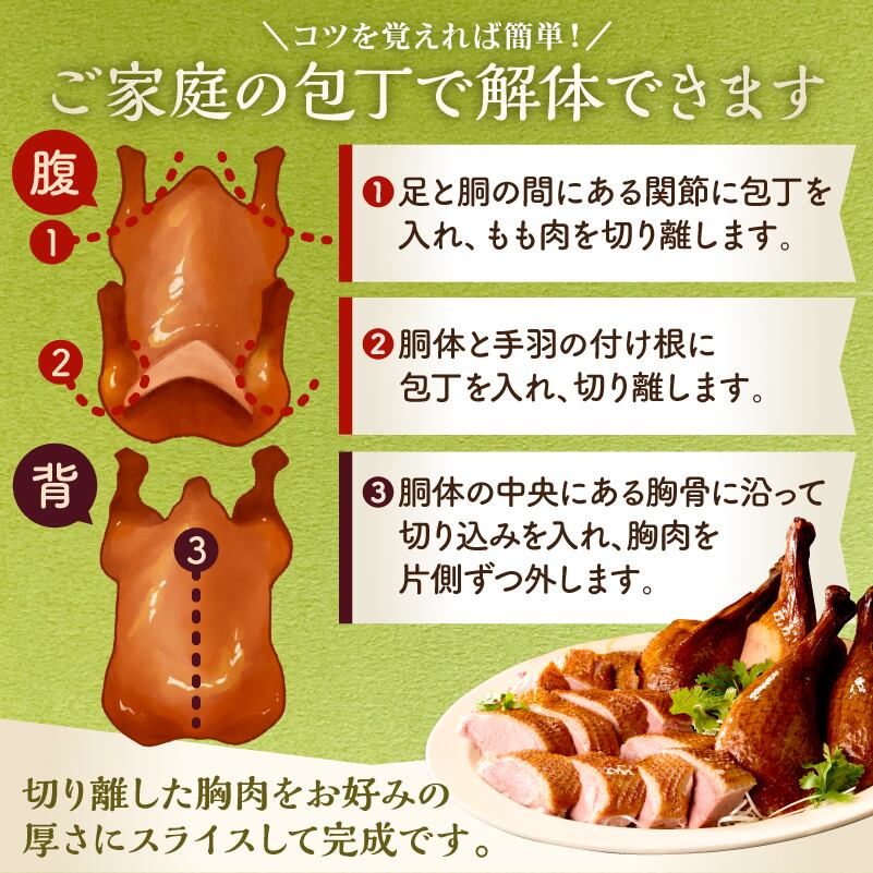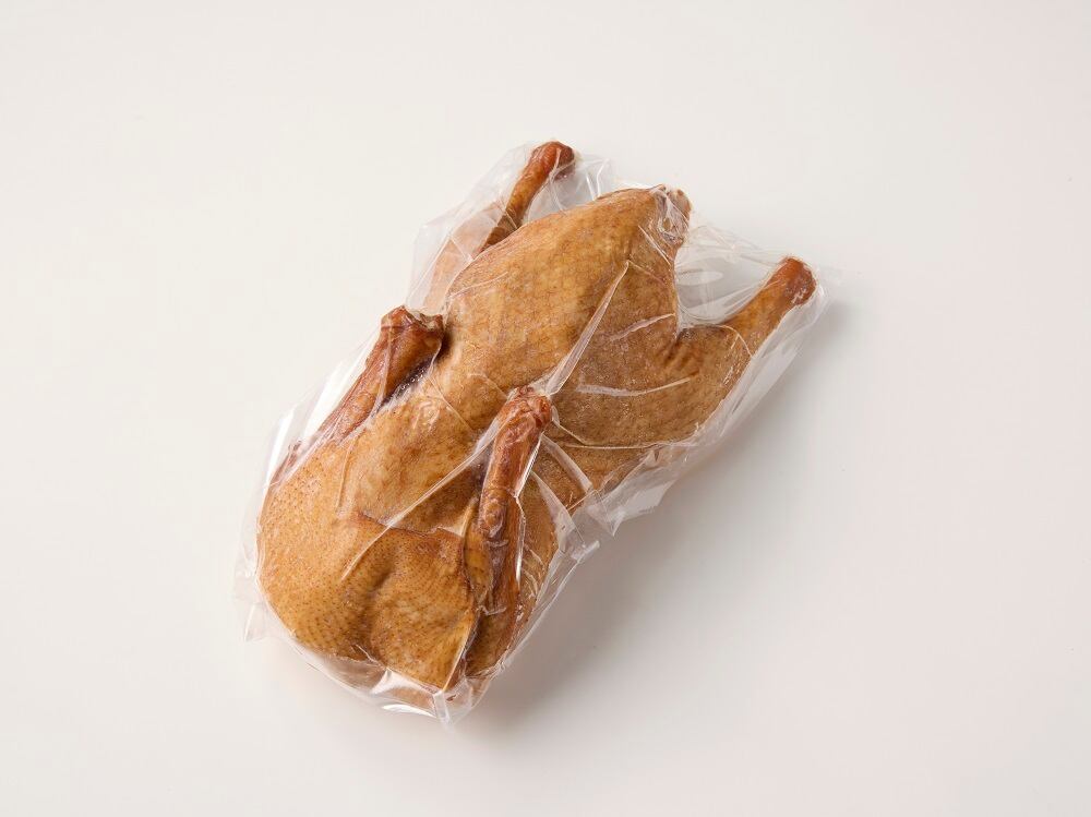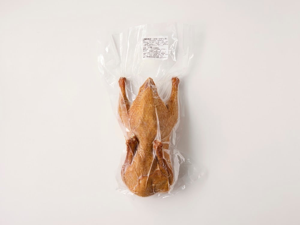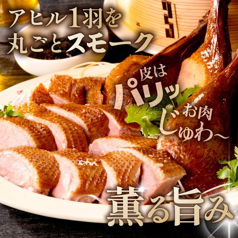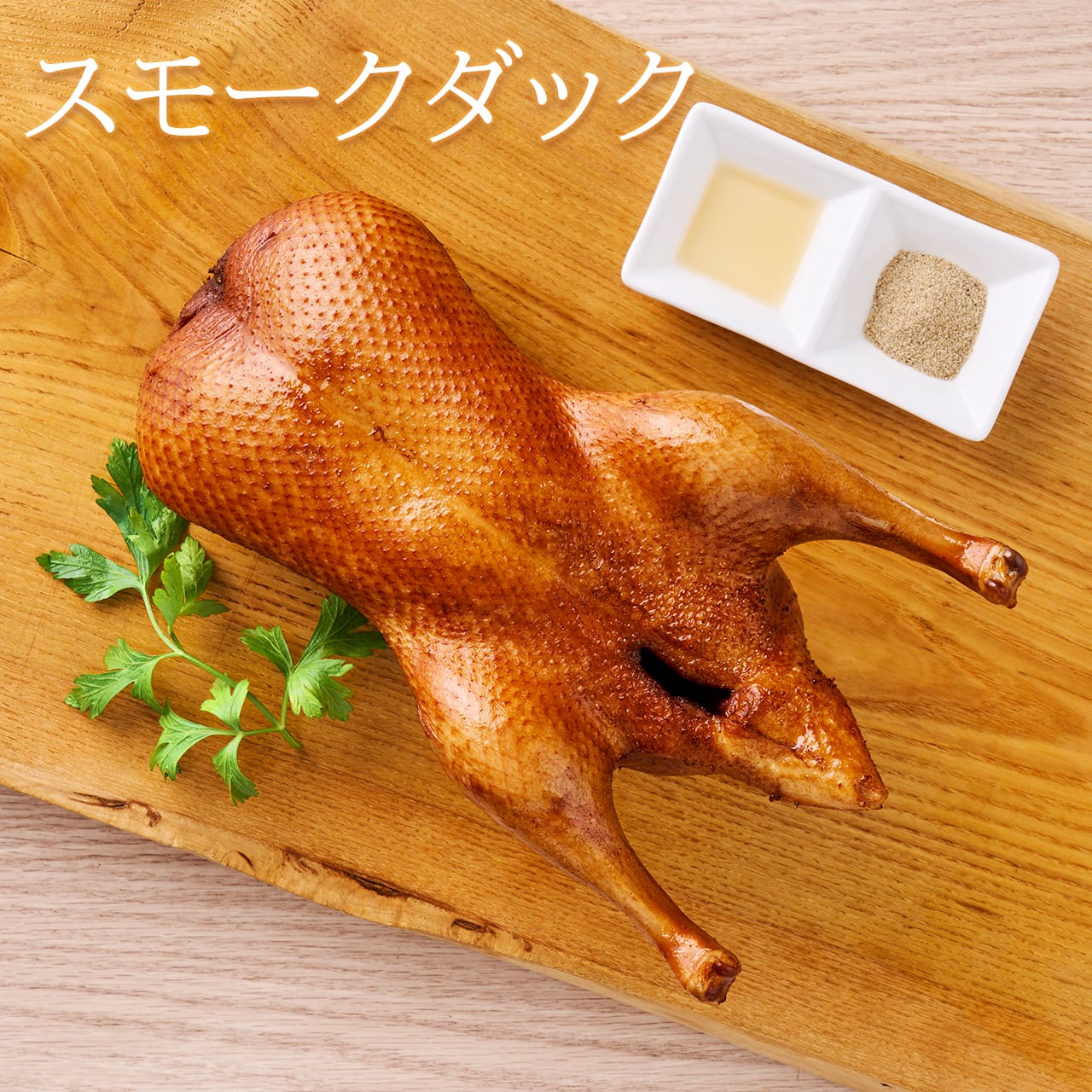 厳選したタイ産のダック(あい鴨)を1羽丸ごとスモーク(燻製)しております。製造工程は、アレルギー物質(特定原材料28品目)を使用せず、下処理からスモークまで当社工場で製造しております。芳醇なスモークの香りと程良い塩味が効いておりますので、そのままお楽しみいただけます。